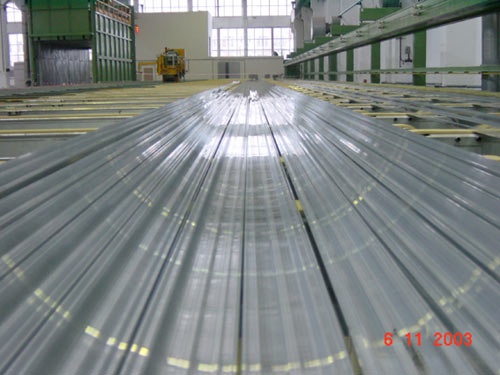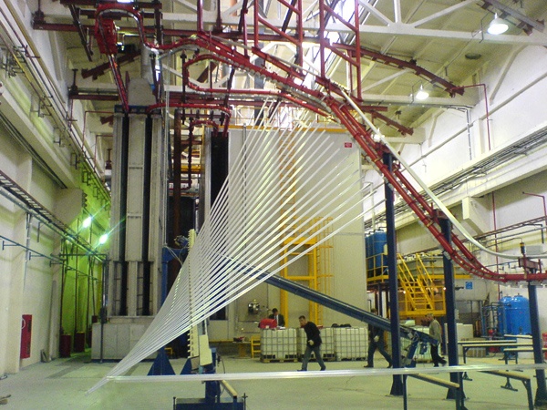 Предпокрасочная подготовкаВ цехе окраски производится порошковое окрашивание алюминиевого профиля, листов и других изделий из алюминиевых сплавов с габаритными размерами не более L 7000 * Н 1700 * В 300. Вертикальная линия Введена в эксплуатацию новая высокопроизводительная вертикальная линиия окраски итальянской компании «Trasmetal». На этой линии смена цвета автоматическая и составляет 20 минут. Производительность окрасочного комплекса может достигать до 40 тонн в сутки. Высокую точность нанесения покрытия обеспечивает 4-ое поколение дисков дисковой системы нанесения порошковой краски, которая дает изменение толщины слоя краски на длину 7 метров всего лишь ±5 микрон. В свете ожидаемой экологической директивы ЕС о запрещении покрытий, содержащих 6-валентный хром, линия оснащена безхроматной технологией подготовки профиля, что позволит поставлять окрашенный профиль в любую европейскую страну |