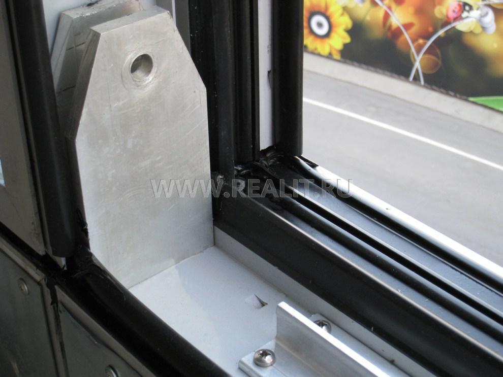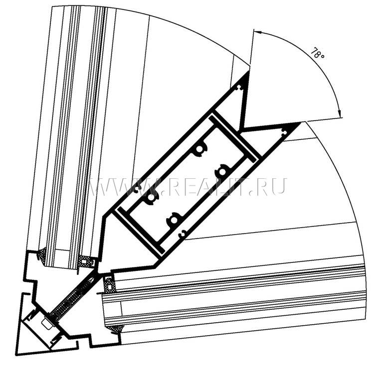 Поскольку фасад здания имеет не только плоские участки, но и полукруглые, в которых угол между двумя соседними модулями составляет 50. Стандартными решениями допускается угол между модулями до 2,50, поэтому специально для данного объекта был разработан новый узел, а также освоено производство нового уплотнителя и штапика для угла перелома 50 между элементами.